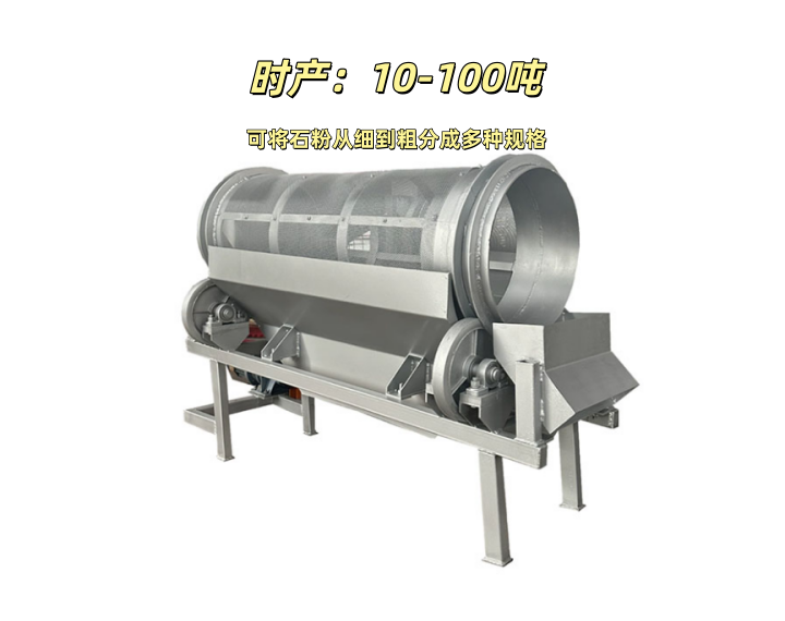 多层滚筒筛筛石粉:筒体内安装2-4层不同孔径的筛网,从进料端到出料端筛框从小到大,一次转动可筛分出多种不同粒径规格的产品石粉,可用于石粉的精细分级场合使用。